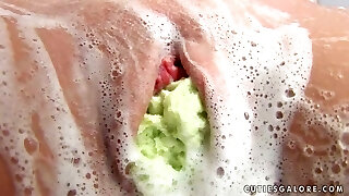 Sweet teen playing with pussy insertions in the kitchen